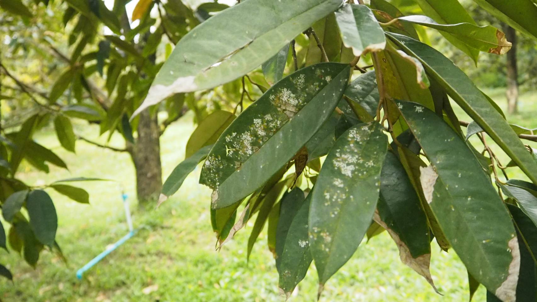 เพลี้ยหอยสีขาวบนใบทุเรียน​ หรือ​เพลี้ยหอย​ขาว​มะม่วง​ (white mango seales) ชื่อวิทยาศาสตร์​: Aulacaspis tubercularis (Newstead, 1906)